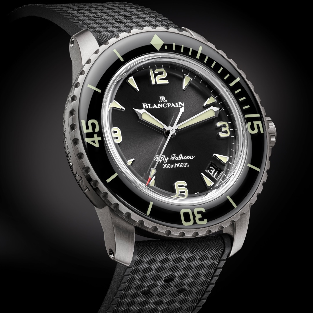 Launched in 1953, the Fifty Fathoms is the first true diver’s watch. Created by a diver to meet the needs of underwater exploration, it was chosen by diving pioneers and combat diver corps around the world as a professional timekeeping instrument. With its water resistance, robust doubled-sealed crown, self-winding movement, contrasting dark dial with luminescent indica- tions, lockable rotating bezel and anti-magnetic protection, the Fifty Fathoms has become an indispensable instrument for divers on their underwater missions.